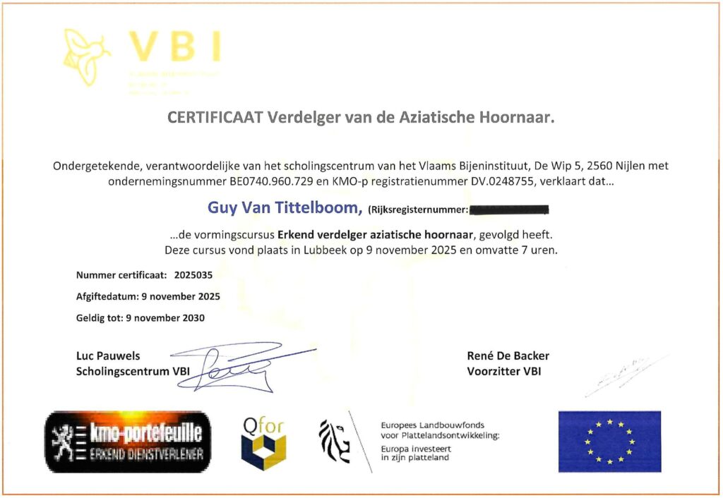 Als erkend verdelger van de Aziatische hoornaar ben ik opgeleid om nesten op een veilige, efficiënte en correct gereglementeerde manier te neutraliseren. Dit certificaat bevestigt dat ik de nodige kennis en vaardigheden bezit om zowel mensen, dieren als onze omgeving te beschermen tijdens elke interventie.